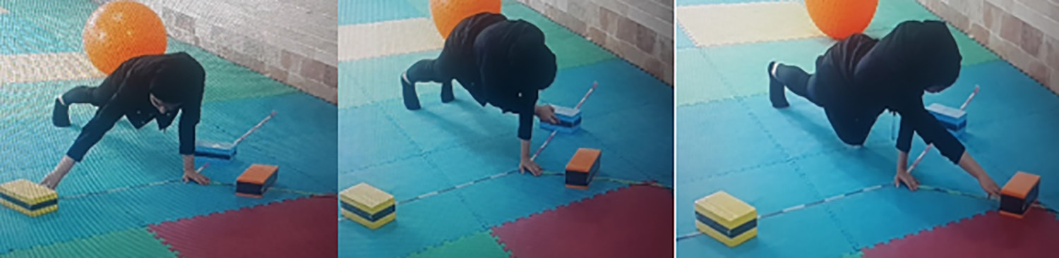 2. The dominant hand is subsequently utilized to reach in three directions: internal, lower, and upper external, each targeting the maximum possible reach distance.