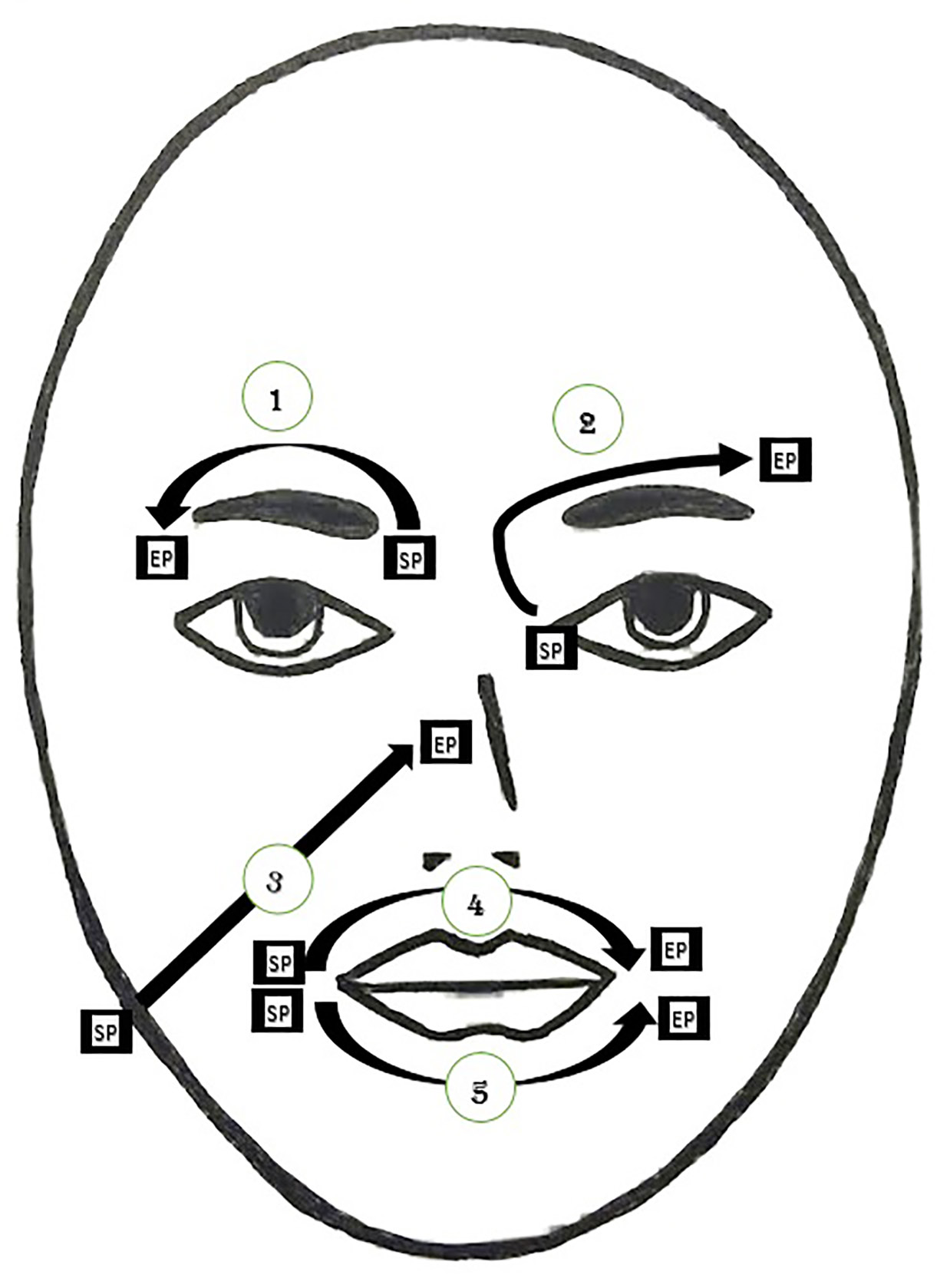 Figure 1. Pathways of facial nerve stimulation. SP: Starting point of pathway; EP: End point of pathway