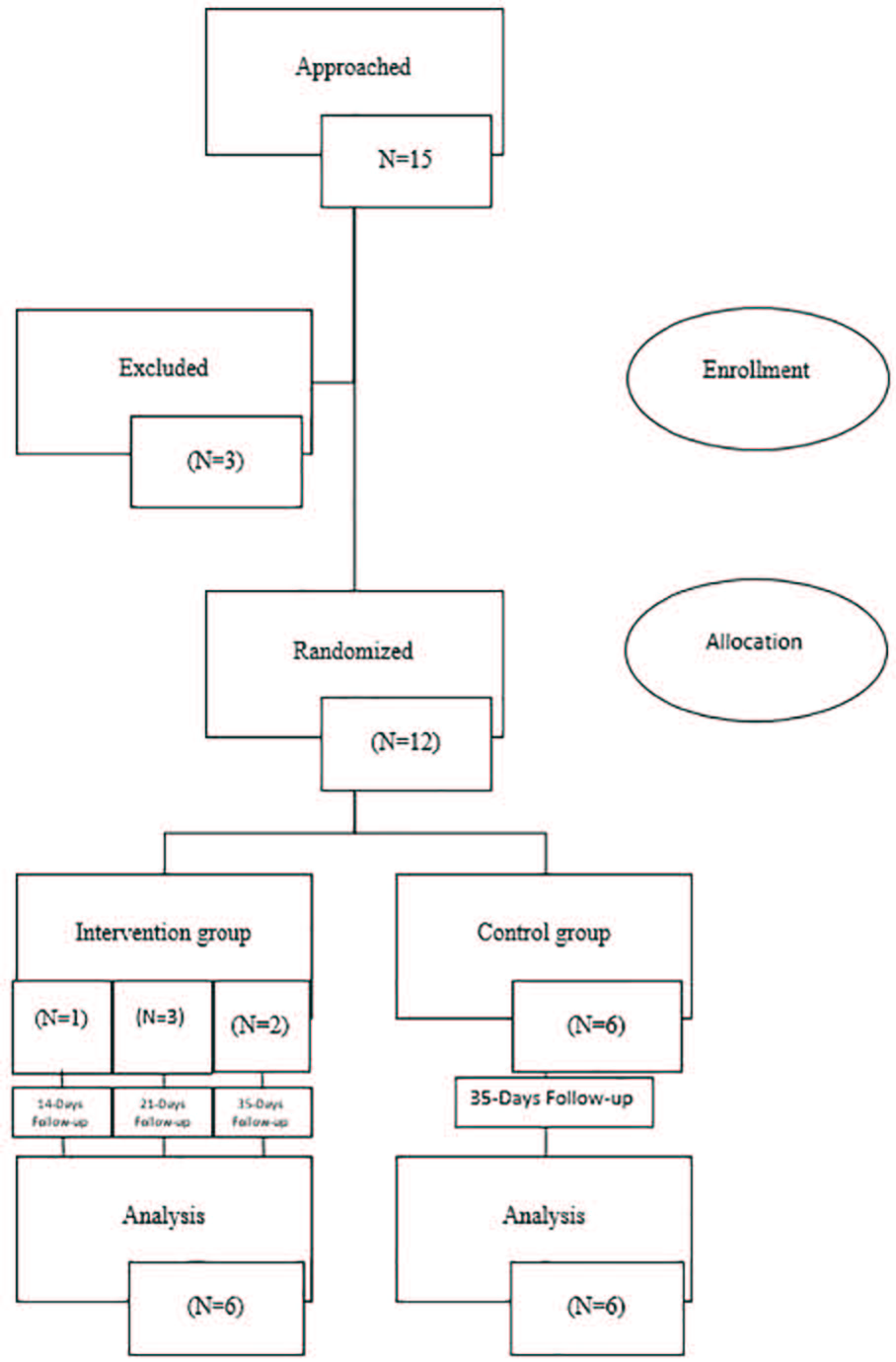 Fifteen stroke patients were initially recruited for this study. However, the final sample size was 12, comprising six women and six men, with a mean age of 72.42±10.66 years, ranging from 54 to 85 years. The intervention and control groups each consisted of three men and three women. Three participants were excluded from the study due to secondary stroke during the study period and unwillingness to continue. These included one patient from the intervention group and two from the control group. Consequently, the study was completed with 12 conscious stroke patients (six females and six males). Statistical analysis was performed on these 12 participants (n=6 per group). The study spanned a maximum duration of five weeks. One patient reached the intended cutoff point after two weeks, three patients after three weeks, and two patients after five weeks (in the sixth examination) (Figure 2)