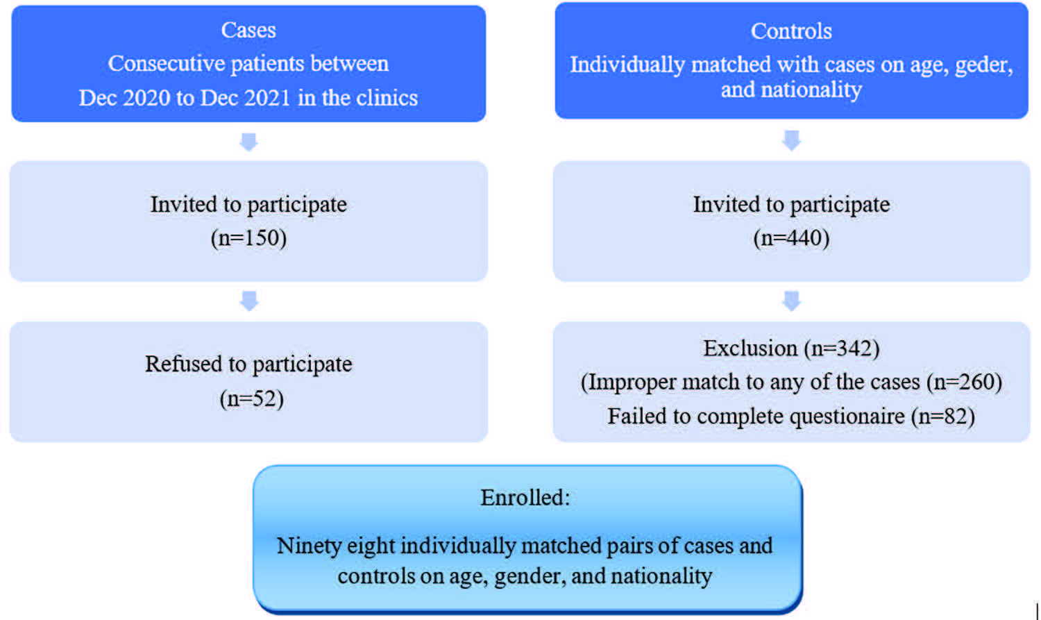 In this study, we initially invited 590 subjects, including patients with ASD (n=150) and individuals without ASD (n=440). However, after excluding 394 individuals who either refused to participate, failed to complete the questionnaires, were improperly matched, or had missing data, we included 196 participants in our analysis. This group comprised 98 cases and 98 controls (Figure 1).