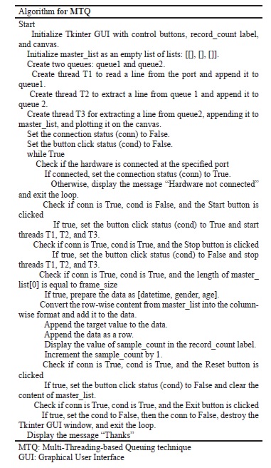 The procedure begins by configuring the Tkinter graphical user interface (GUI), which includes creating control elements, a label for record count display, and a graphical area for data visualization. A triple-list data structure is initialized to store visual data, with two sequential data structures (queues) set up for interim data handling. Three processes (T1, T2, and T3) facilitate data flow: T1 handles data input, T2 manages data transfer between queues, and T3 updates the visual data structure, generating a real-time graph. The size of the data structure is managed to stay within a predefined limit. The system’s connection status is continuously monitored, with active data processing occurring only after successful hardware linkage and user interactions through the interface controls. The data processing phase compiles a dataset containing temporal, demographic, and measurement information, converts it into a columnar format, and updates the dataset count incrementally. System reset or termination commands prompt the necessary clean-up processes, concluding the algorithm’s execution with a confirmation message.