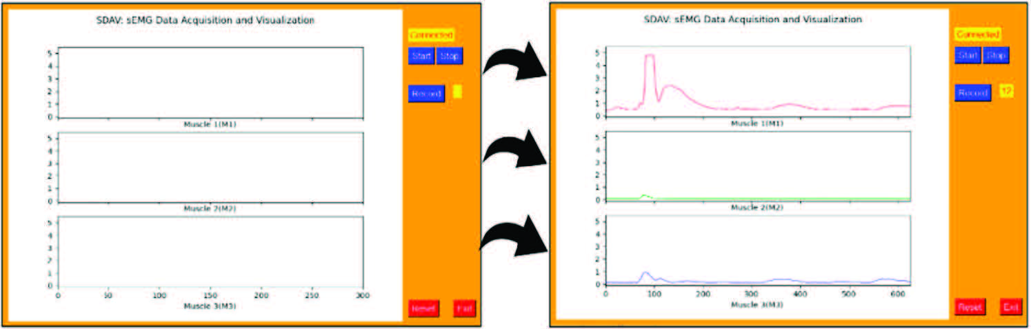 Four control buttons—Start, Stop, Reset, and Record— were integrated into the GUI to ensure smooth data collection. The developed GUI,combined with the proposed multi-threading-based queuing (MTQ) technique for sEMG data acquisition, enables real-time visualization.