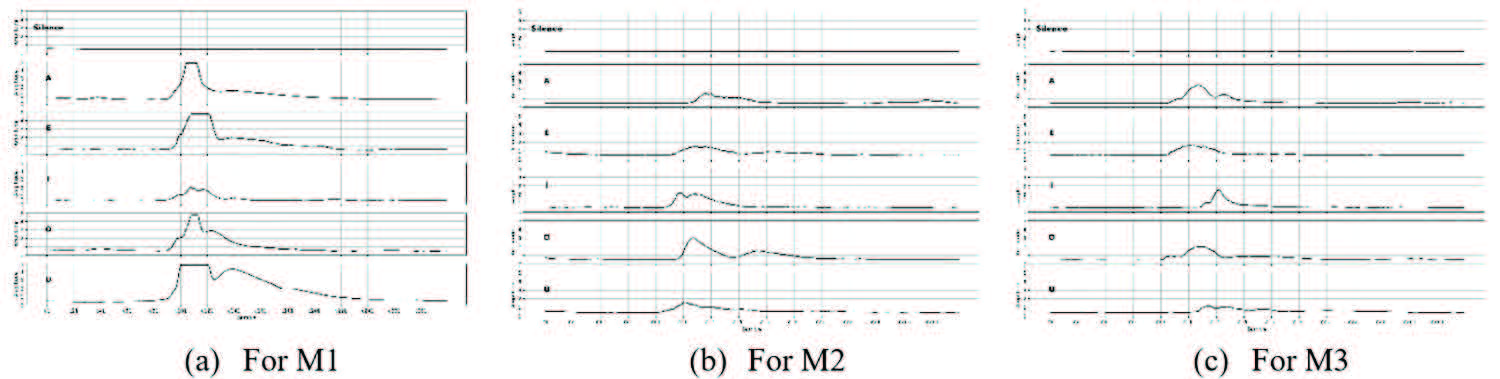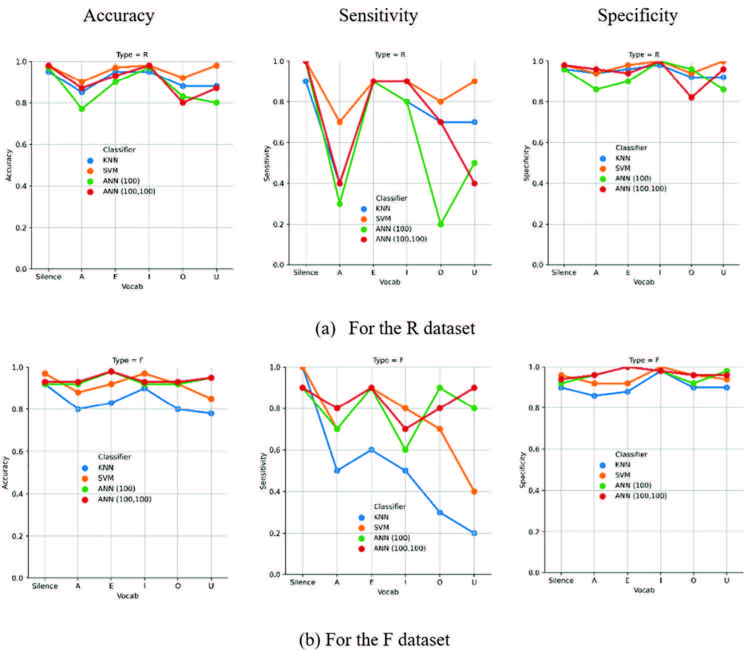 The R and F datasets, derived from the primary dataset, were input into the classifiers, and Table 3 displays their classification accuracy. For the R dataset using Model1, the classification accuracies for each vocabulary item (Silence, A, E, I, O, and U) are 0.95, 0.85, 0.95, 0.95, 0.88, and 0.88, respectively, resulting in a mean accuracy of 0.91 for Model1. Similarly, the mean accuracies for the R dataset with Model2, Model3, and Model4 are 0.95, 0.87, and 0.90, respectively. The overall mean accuracy for the R dataset is 0.91, obtained by averaging each model’s mean accuracy.
