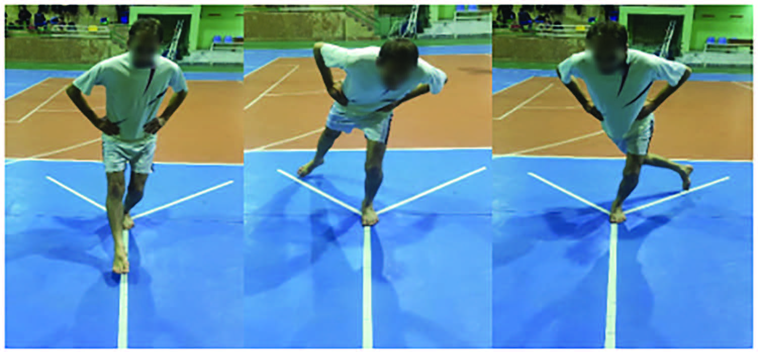 The Y Balance Test was conducted to measure dynamic balance (Figure 4). Participants positioned themselves at the center of the testing area, standing on their dominant leg and reaching out with the opposite leg to touch a target point in a specified direction. After reaching, they returned to a balanced stance on both legs, maintaining this position for 10 to 15 seconds before the next trial. Trials were completed in one direction first, then switched to another in a clockwise or counter-clockwise order. In each trial, participants aimed to reach the farthest possible distance with their toes in the designated direction, with the reach distance recorded from the center point to the point of contact in centimeters.