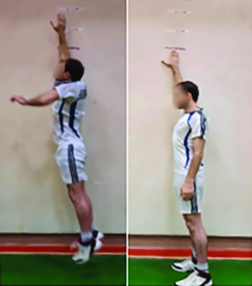 The Sargent jump test assessed the athletes’ performance (Figure 6). In this test, each athlete stood sideways next to a marked wall, reached upward with one hand, and the highest point reached was marked. The athlete then performed a maximal vertical jump, marking the highest point reached during the jump. The distance between the initial and jump marks represented the athlete’s muscular power; a greater distance indicated higher muscle power [ 36 ]. Aragon reported the test’s validity and reliability as 0.93 [ 37 ].