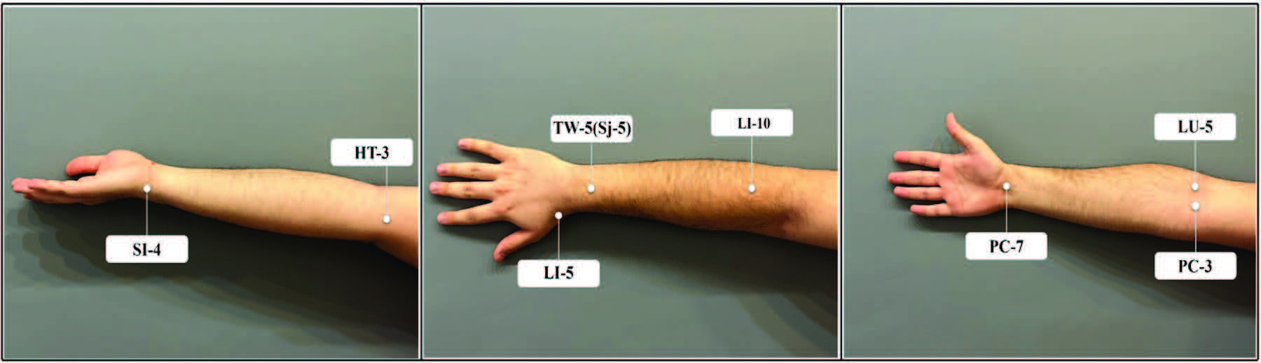 Eight specific acupoints will be targeted on the affected hand: TW-5, PC-7, HT-3, PC-3, SI-4, LI-5, LI-10, and LU-5. Patients will be positioned supine. Following skin disinfection, the therapist will insert sterile 0.25x40 mm needles into these acupoints using a guide tube. Needle insertion depth will vary from 1 to 3 cm, depending on the thickness of each patient’s wrist, hand, and forearm. After insertion, the therapist will manipulate each needle until the patient reports sensations of soreness, numbness, or heaviness at the acupoints, indicating the arrival of Deqi. Once Deqi is achieved, electrical stimulation will be applied to four pairs of acupoints: TW-5 + PC-7, SI-4 + LI-5, LI-10 + LU-5, and HT-3 +PC-3. The SDZ-II electroacupuncture device will deliver a continuous 2–4 Hz wave at a tolerable intensity to the patient. Electrical stimulation will be maintained for 20 minutes before removing the needles (Figure 2) [ 18 ].