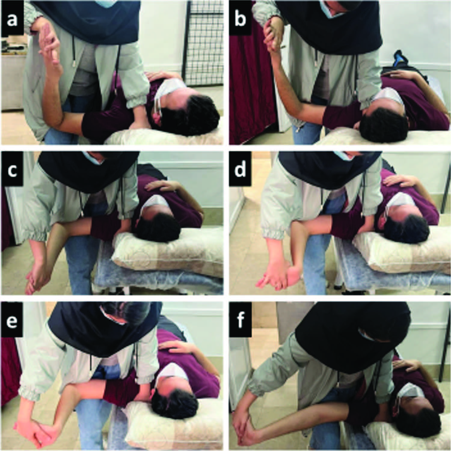 Figure 3. Median neurodynamic techniques sequence, a) Starting position b) Arm abduction c) Arm external rotation d) Forearm supination e) Wrist and fingers extension f) Elbow extension.