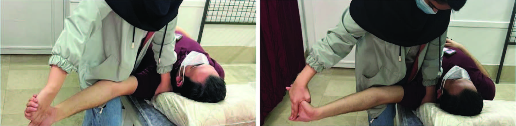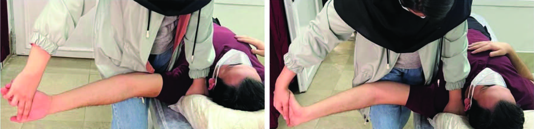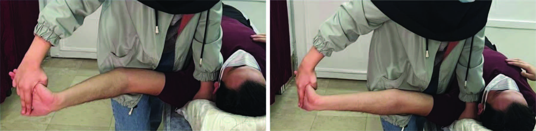 1) One-ended proximal slider mobilization: The therapist will extend the elbow in the mentioned position through mid-range with a large amplitude (Figure 4).