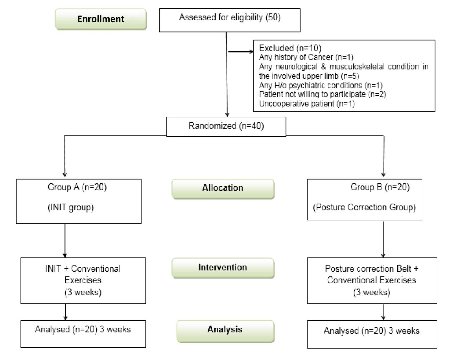A simple random sampling technique was used for participant selection. Forty participants with mechanical neck pain were recruited based on the eligibility criteria from the university's physiotherapy outpatient department (OPD) and other hospital OPDs in the city. They were randomly allocated into two equal groups using the lottery method. Allocation concealment was maintained through an open list of random numbers. Group A received the Integrated Neuromuscular Inhibition Technique (INIT), while Group B was provided with a posture correction belt, which was applied for 20 minutes daily. Standard conventional exercises were administered to both groups.