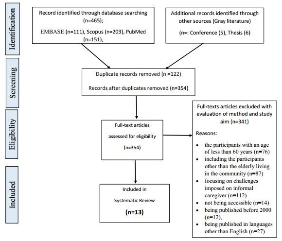 A total of 341 articles were excluded for the following reasons: 1) Inclusion of participants younger than 60 years old (n = 76), 2) Inclusion of participants other than community-dwelling older adults (n = 87), 3) ocus on general caregiver challenges rather than informal caregiving (n = 112), 4) ack of access to full text (n =14), 5) Publication before the year 2000 (n = 12), and 6) Publication in languages other than English (n = 27).