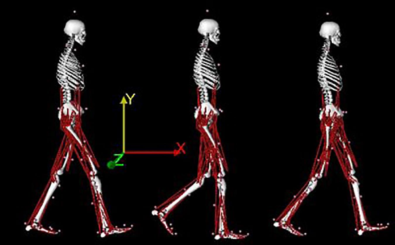 Data were imported into OpenSim software to build a musculoskeletal model with 23 degrees of freedom and 76 scaled muscles for each subject (Figure 1). To evaluate dynamic stability, force plate data were recorded using a Kistler force plate (Kistler Instrument®, Winterthur, Switzerland). Dynamic stability was assessed via center of mass (COM) movement in the mediolateral and vertical directions, which were normalized to the base of support and leg length of each subject, respectively.