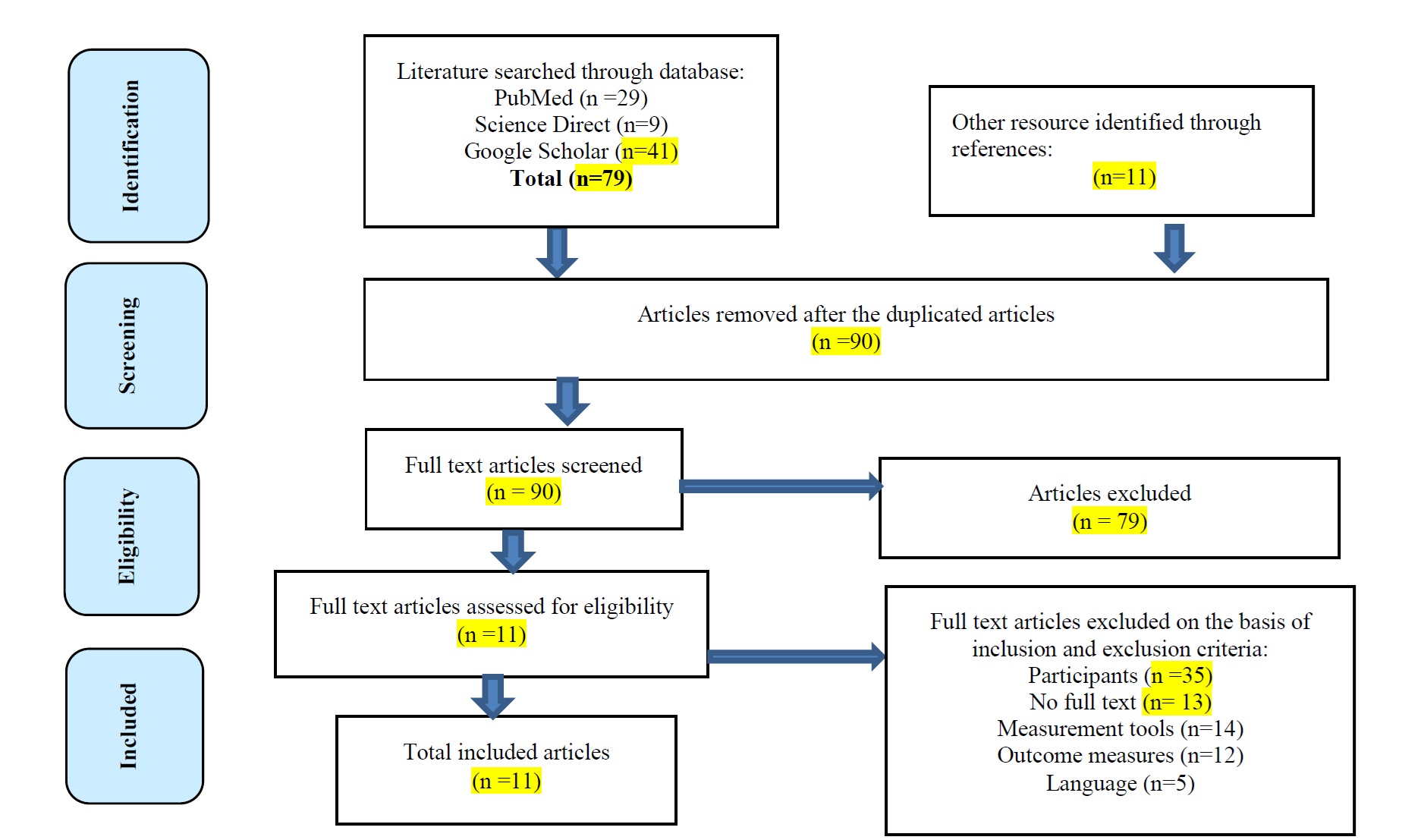 A total of 90 articles were identified and reviewed. Of these, 11 articles met the eligibility criteria and were included in the systematic review, while 79 were excluded (Figure 1). All included studies were assessed for methodological quality using the Modified Downs and Black checklist.