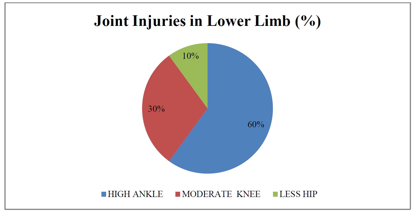 Based on the extracted data, 70% of injuries were classified as mild, 20% as moderate, and 10% as severe, with these distributions observed predominantly at the elbow and ankle joints in the upper and lower limbs, respectively (see Table 3 and Chart 1). Furthermore, in the upper limb, the prevalence of soft tissue injuries was 70% at the elbow, 20% at the shoulder, 8% at the wrist, and 2% at the fingers (see Table 4 and Chart 2). In the lower limb, soft-tissue injuries were most commonly reported at the ankle (60%), followed by the knee (30%) and the hip (10%) (see Table 5 and Chart 3).