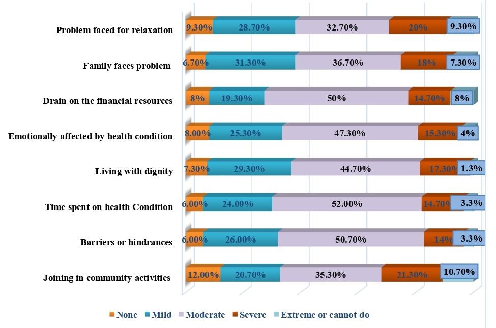 Figure 1 illustrates that, regarding community participation (WHODAS 2.0), the largest proportion of participants (43.68%) exhibited a moderate level of disability. Only 7.91% reported no participation-related difficulties. Across the eight domains, most participants experienced mild disability in maintaining personal dignity (29.30%), while the highest proportion exhibited moderate disability in managing time spent on health conditions (52%). Severe (21.30%) and extreme (10.7%) restrictions were reported when attempting to engage in community activities. Correlation analysis between WHODAS 2.0 and LISAT-11 revealed a strong negative association (rp = -0.852, p = 0.001), indicating that higher levels of disability were associated with lower life satisfaction.