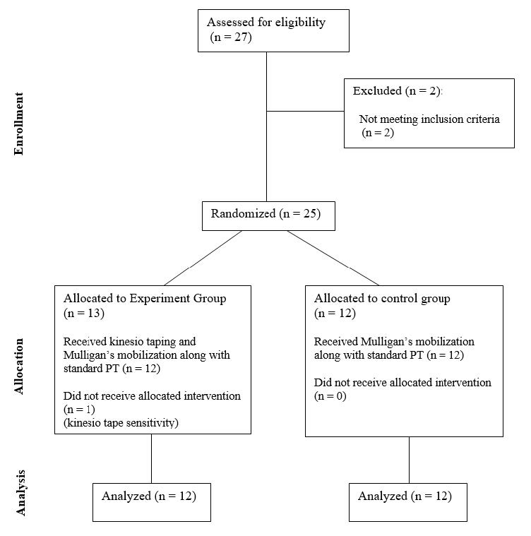 Randomization was performed using computer- generated block randomization (block size = 4; allocation ratio = 1:1). Participants were randomly assigned to one of two groups: 1) Control group: Mulligan mobilization combined with conventional physiotherapy, and 2) Experimental group: Kinesio taping following Mulligan mobilization combined with conventional physiotherapy.