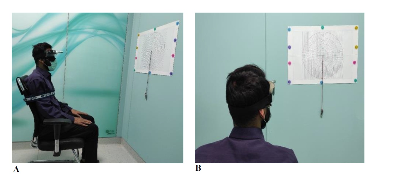 During assessment, participants were seated upright on a chair with back support, facing a target positioned 90 cm away. Hips and knees were flexed at approximately 90°, and feet were placed flat on the floor. To prevent thoracic rotation, the participant’s chest was secured with a strap. The target consisted of a 40 cm diameter circle, aligned so that the laser pointer affixed to the participant’s forehead corresponded to the center of the circle (Fig. 2A).