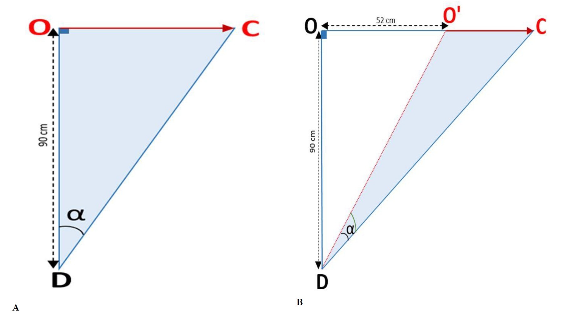 Figure 3. Target head position(D = patient, O = Center of target in neutral position, C = Spotlight in NHP test, O’ = Center of moved target, C’ = Spotlight in THP test, α = Repositioning error angle)