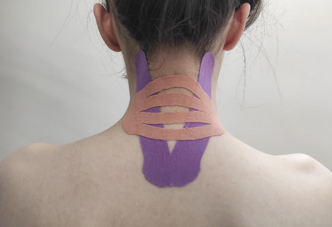 A Y-shaped strip was first applied along the cervical extensor muscles from the insertion to the origin. The base of the tape was lightly adhered over the upper thoracic region (T1–T2) while the patient maintained a neutral head and neck position. Participants were then asked to rotate and laterally flex the head to the opposite side, after which the tape was applied along the neck with approximately 15–25% tension to target the paraspinal musculature. The terminal ends of the tape were anchored over the occipital region without tension, with the head returned to a neutral position.
