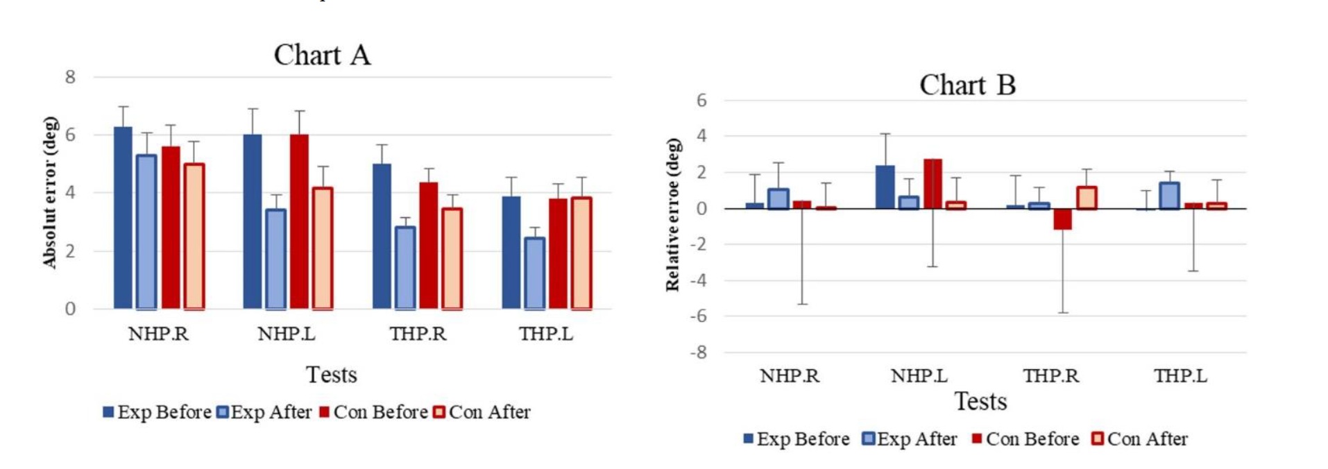 Regarding relative errors (Fig. 5, Chart B), no significant changes were observed over time in either group. Additionally, between-group comparisons revealed no statistically significant differences in the mean change in relative repositioning error.