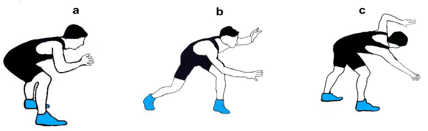 Figure 1. Graphical representation of the shadow freestyle tie-up drill (SFTUD). This drill involves (a) an initial stance with a flexed posture and hands prepared for engagement and (b & c) extending the arms forward to simulate gripping an imaginary opponent, accompanied by footwork and pivoting movements.