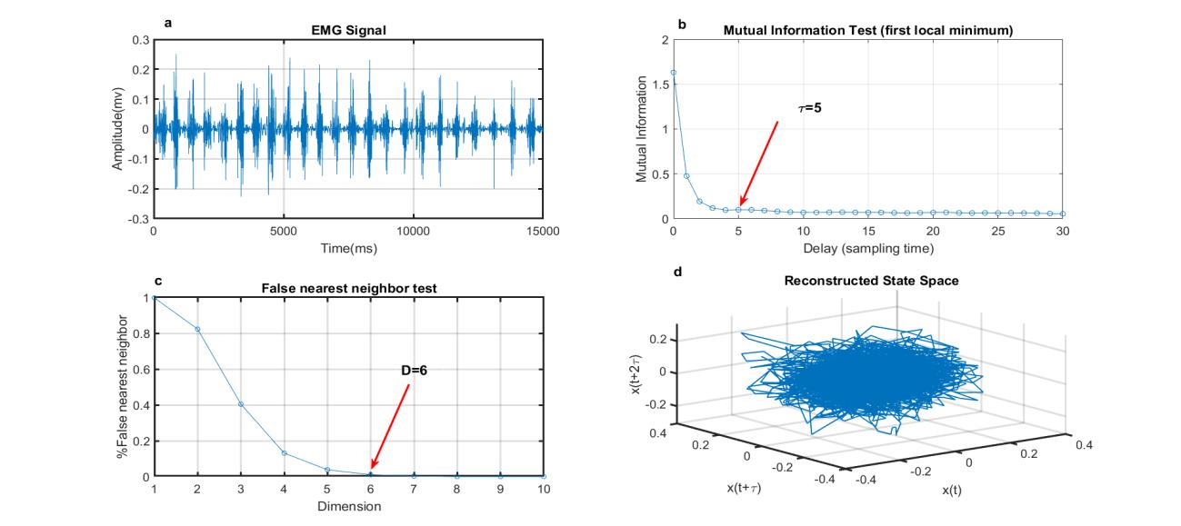 Figure 2. Reconstruction of the state space of electromyography ( EMG ) data. (a) Raw electromyography (EMG) activity was recorded from the target muscles. (b) Depiction of mutual information evaluation applied to determine the best delay time (τ). (c) The false nearest-neighbor method was applied to determine the embedded dimension (D). (d) Reconstruction of the electromyography (EMG) signal’s three-dimensional state space for each muscle.