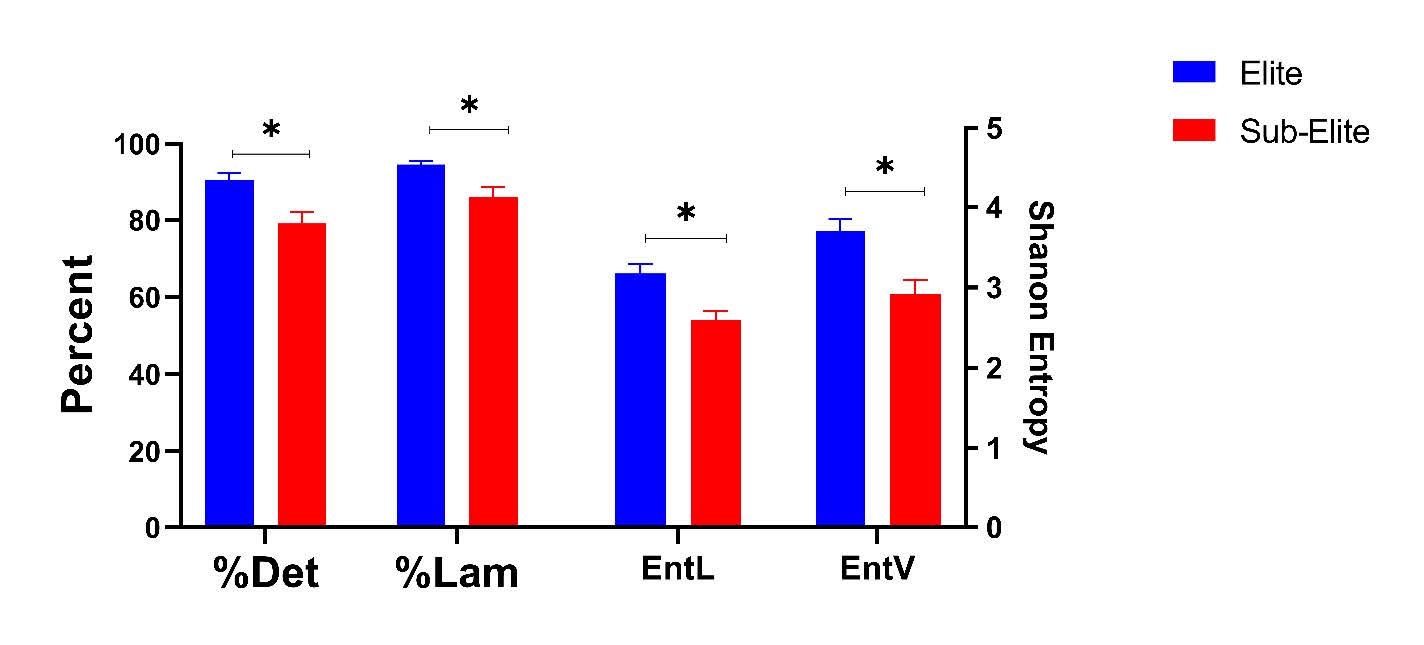 Figure 3. Comparison of recurrence patterns in elite versus sub-elite wrestlers performing the shadow freestyle tie-up drill (SFTUD). Determinism (%DET) and Laminarity (%LAM) are displayed on the left axis, whereas Shannon entropy values for horizontal (EntL) and vertical (EntV) recurrence are shown on the right axis. Asterisks (*) above the bars denote statistically significant differences between the groups (P < 0.05).